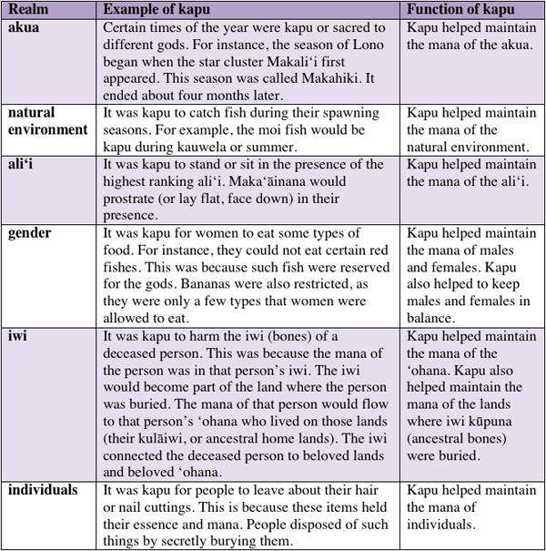 Traditionally, there were different kapu for different aspects of our world. Each had an important function. Check out the table below: